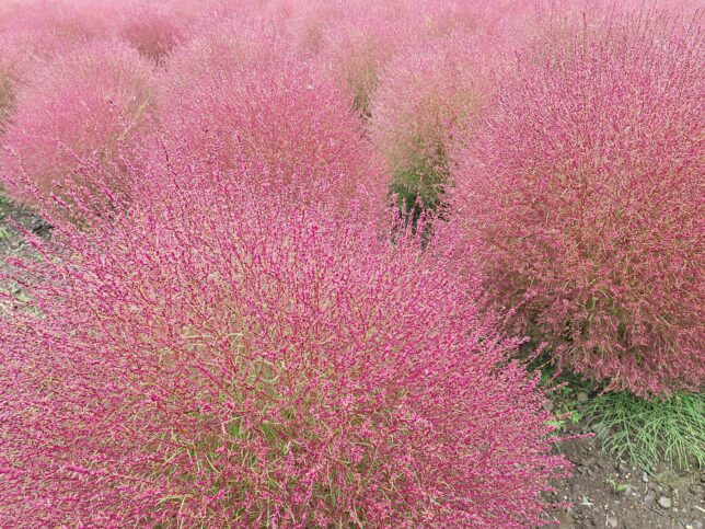 Now is a good time to see the autumn colors of summer cypress (Bassia scoparia or Kochia scoparia) plants in Oishi Park in the town of Kawaguchiko in Yamanashi Prefecture, Japan.