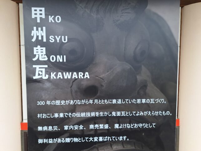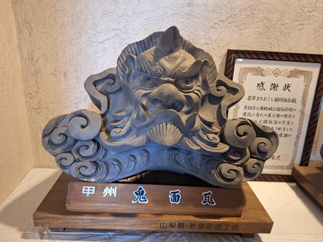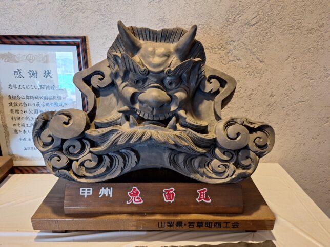 Onigawara are decorative roof tiles placed at the ends of the roof ridge, often depicting the face of an oni (Japanese ogre) or other designs. The city of Minami-Alps is recognized as the production site for Koshu onigawara. The Wakakusa district in the city has a long history of tile-making, and today the Wakakusa Kawara Kaikan (Tile Museum) preserves this tradition and allows visitors to experience making these crafts.