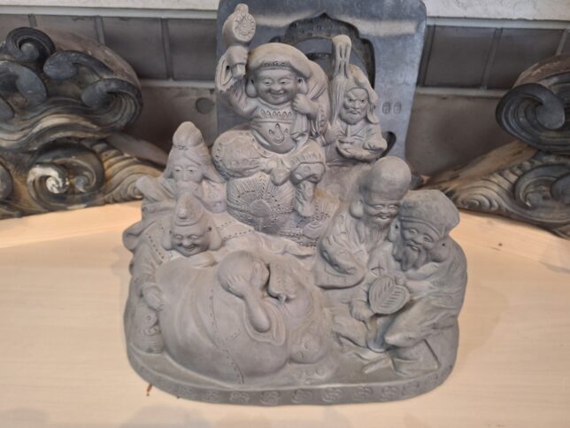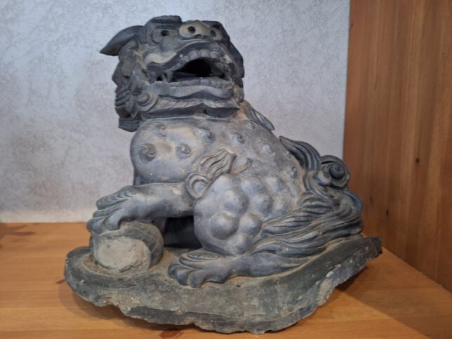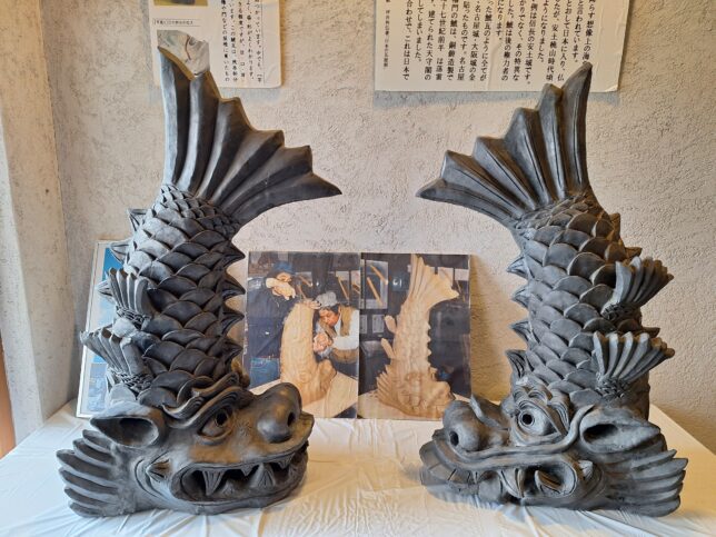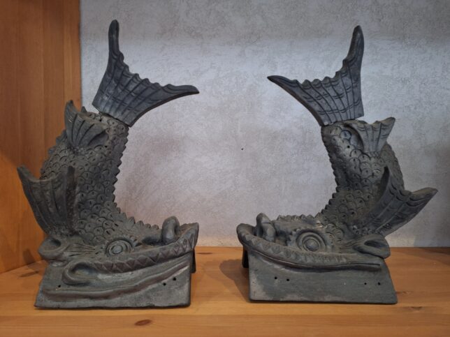 Shachihoko are mythical Japanese creatures with a tiger’s head and a carp’s body. They are also placed as roof ornaments on Japanese castles and temples to serve as protective, fire-extinguishing spirits, usually appearing in male-female pairs. Shachihoko are also made in the Wakakusa district using the local clay.
