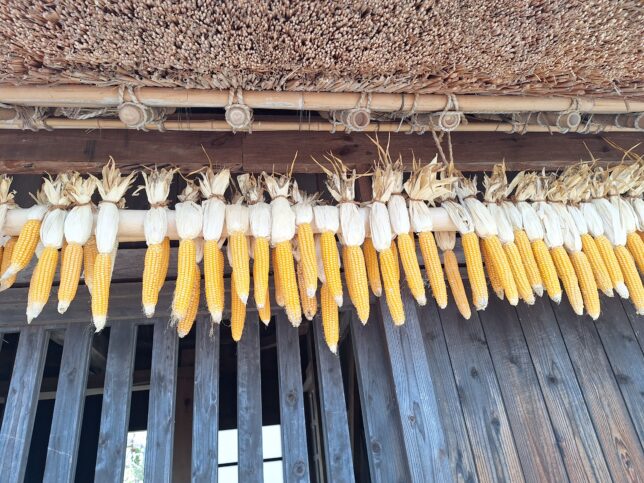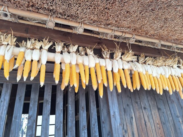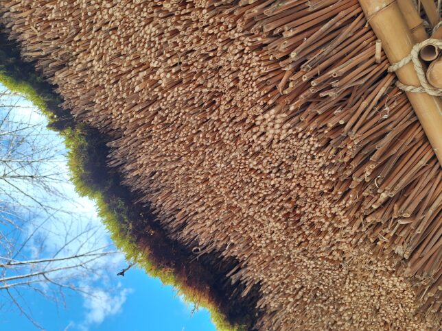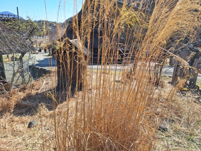 Thatched roofs in Japan, known as kayabuki, primarily use kaya (a general term for thatch) harvested from Miscanthus grass, specifically Japanese pampas grass susuki (Miscanthus sinensis) and kariyasu. Other materials include reed (yoshi), cogongrass (chigaya), and rice straw. These materials are harvested, dried, and bundled to create a durable, insulating 30–40 year roof.
