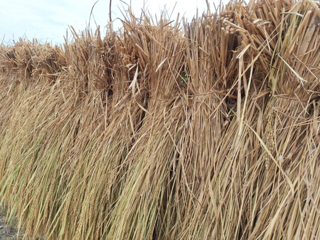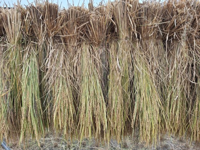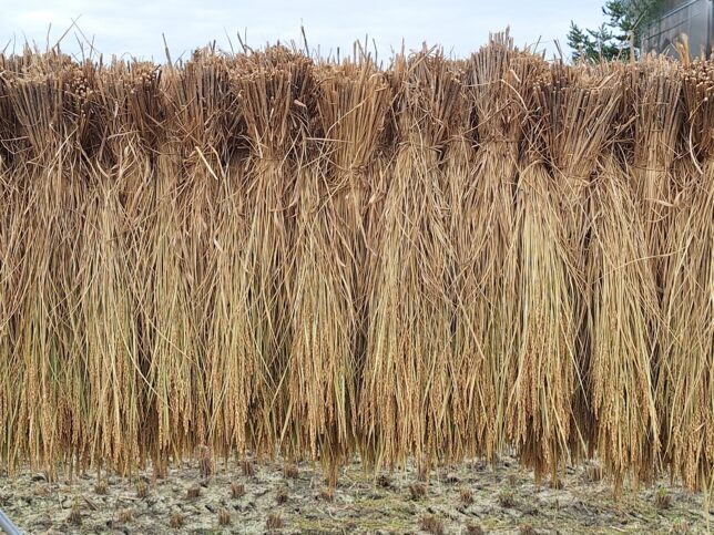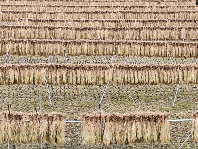 Hasa-gake, hanging rice to dry: Hasa-gake is a traditional Japanese method for sun-drying harvested rice, where harvested rice plants are hung up to sun-dry in order to enhance the rice’s flavor and stickiness.