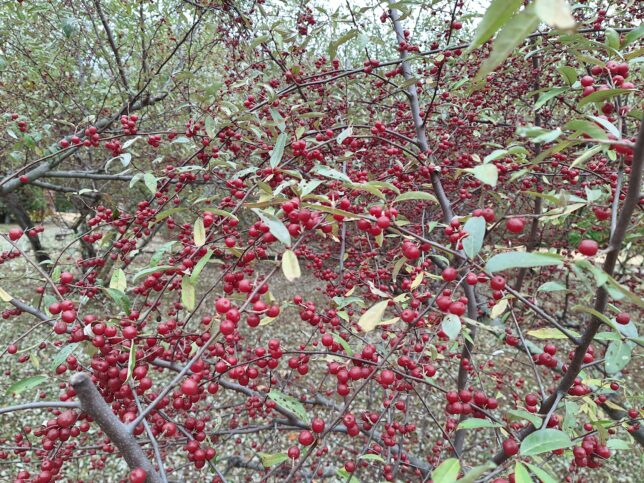 Japanese silverberry (Elaeagnus umbellata): https://en.wikipedia.org/wiki/Elaeagnus_umbellata