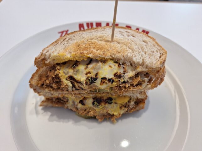 A Cuban sandwich is characterized by its layered fillings (mojo-marinated roast pork, glazed ham, Swiss cheese, pickles, and mustard) on Cuban bread, pressed and grilled until the bread is crispy and the cheese is melted, creating a warm, savory, tangy, and buttery sandwich with a distinct crispy crust and soft interior. It seemed that Cuban-style sandwiches in Japan were created by DAY WORK & COMPANY・TOKYO in Niigata Prefecture with their CHEAT DAY brand around 2018. The inclusion of a spicy sauce suggests a departure from the traditional recipe, creating a flavor profile that appeals more to the Japanese palate.