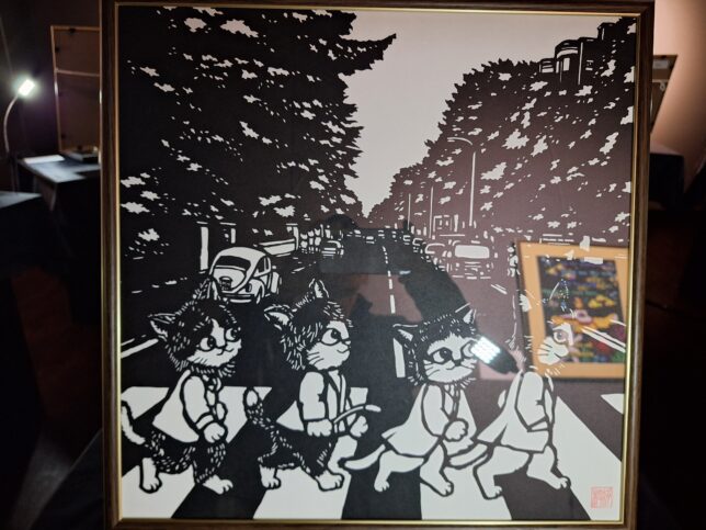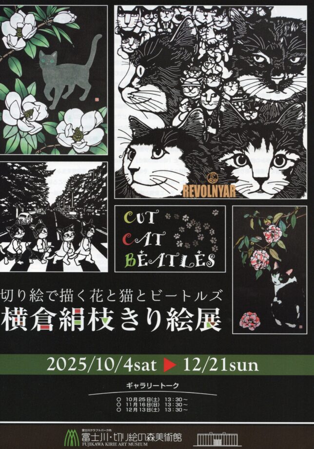 A papercutting exhibition titled Flowers, Cats, and the Beatles “CUT CAT BEATLES” by Kinue Yokokura has been held at the Fujikawa Papercutting Museum in Yamanashi Fujikawa Craft Park in the town of Minobu in Yamanashi Prefecture, Japan from October 4 through December 21, 2025.