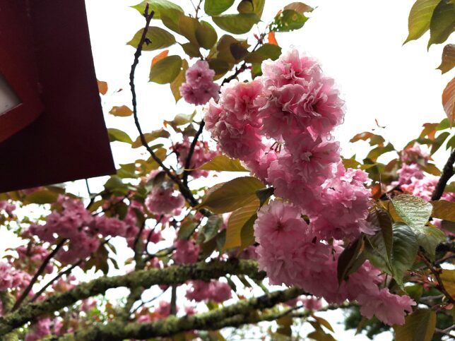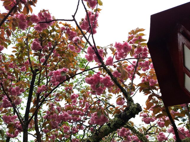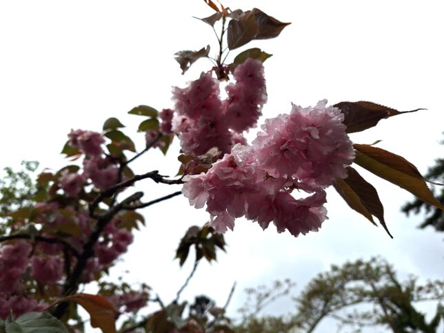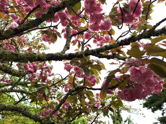 “Double-flowered” describes varieties of flowers with extra petals, often containing flowers within flowers. Yaezakura in Japanese means double-flowered cherry blossoms and Prunus ‘Kanzan’ is a representative cultivar of the Yaezakura cherry blossoms. Kazan is a double flower cultivar with with 20 to 50 petals.